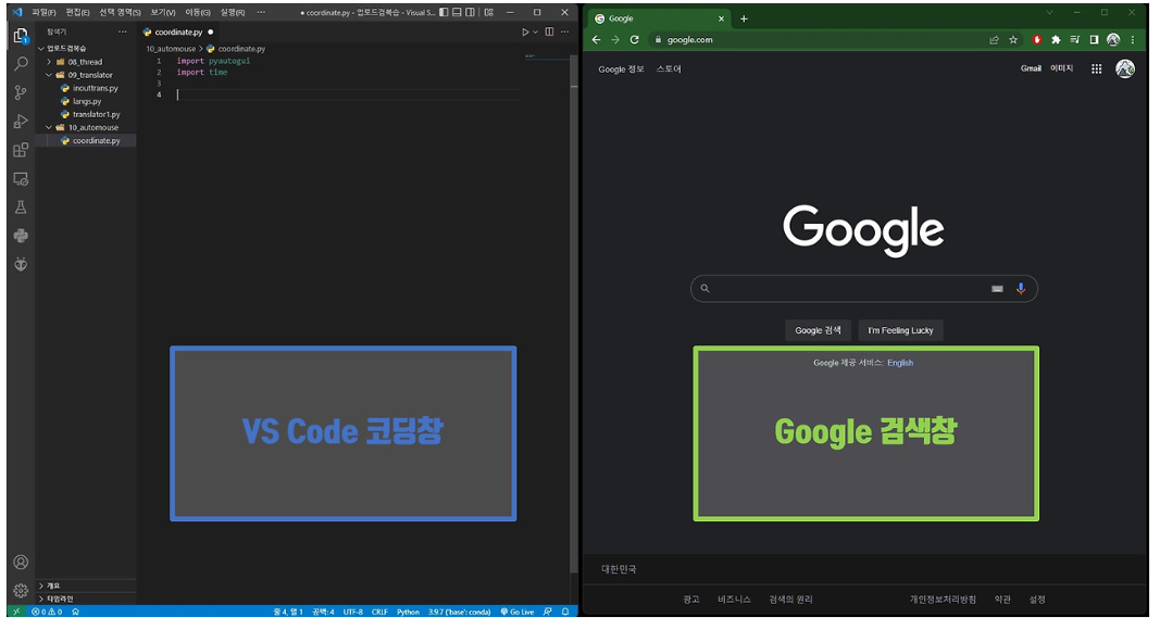 키보드, 마우스 자동 제어 기능을 활용해서 구글 검색을 시도해 보겠습니다.